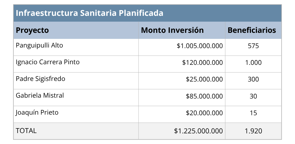 Por su parte, el Informe de Saneamiento Sanitario de Panguipulli (SECPLAN, Mayo 2021) detalla las inversiones realizadas por la Municipalidad para mejorar la infraestructura sanitaria urbana, independientemente de los compromisos de ESSAL.