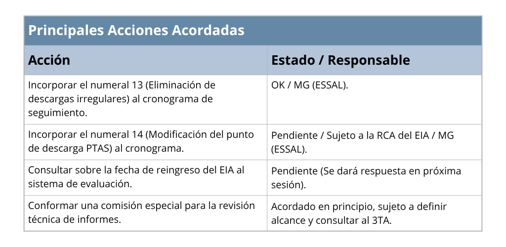 La conformación del Comité Técnico de Seguimiento del Acuerdo de Conciliación (CTSAC) materializó el compromiso de establecer un mecanismo de gobernanza y participación comunitaria. Este comité fue diseñado como el ente fiscalizador encargado de vigilar el cumplimiento de cada uno de los puntos acordados ante el Tercer Tribunal Ambiental, integrando a representantes de la empresa, el municipio y, de manera crucial, a la sociedad civil organizada.